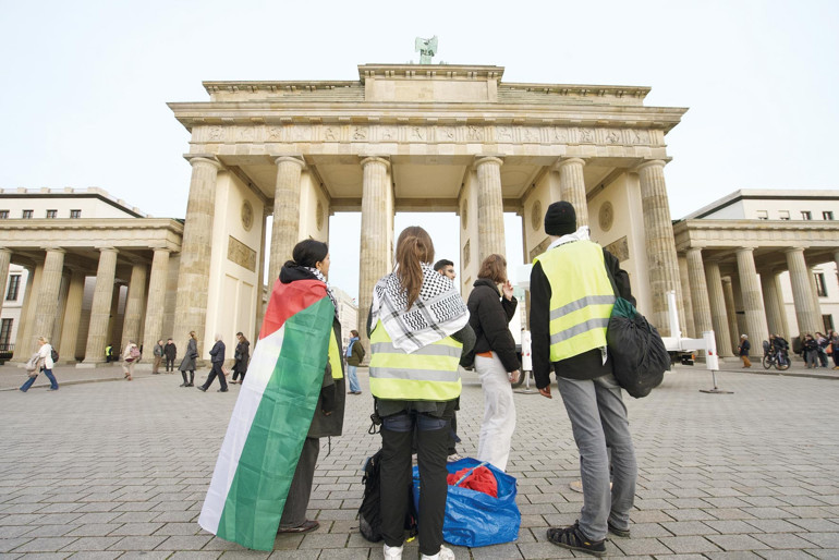 Üç kişilik eylemci grubu, bir vinç yardımıyla tarihi kapının tepesine çıkarak “Bir daha asla soykırım–Filistin’e özgürlük” yazılı pankartı astı. Olayın başkentin simge yapılarından birinde meydana gelmesi büyük yankı uyandırırken, itfaiye ile koordineli çalışan özel eğitimli polis timleri, tarihi yapıya tırmanarak üç eylemciyi gözaltına aldı. Vinci kullandıkları tespit edilen diğer üç kişi de olay yerinde gözaltına alındı.