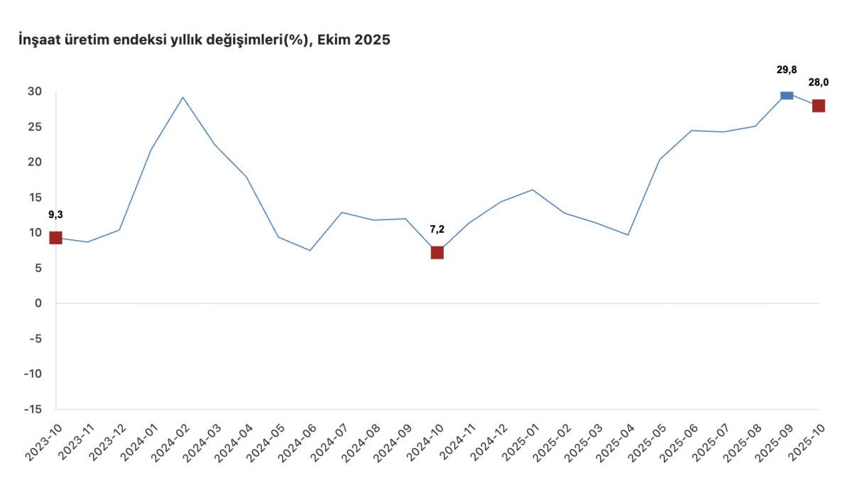 İnşaat üretim endeksi ekimde yıllık yüzde 28 arttı